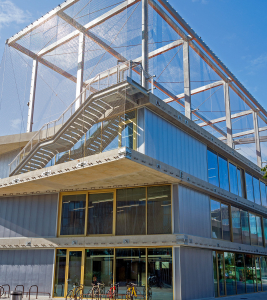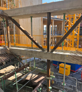 The site is brownfield and vibro piles were selected for most of the foundations in order to minimise arisings, overall depth and interaction with buried obstructions. The main structural features of Building C1 are its unusually deep floor zones, several large cantilevered elements and the external circulation, which wraps around an external precast concrete staircase as well as two walls of the building. Steel mesh encloses the entire structure from first floor up, including the basketball court.