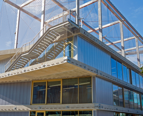 The facades are mostly glazed curtain walling, with the roof level left open, enclosed in the stainless steel mesh, which is supported on a steel sway frame. The mesh continues down the building, spanning 13m to a corner of the walkway.