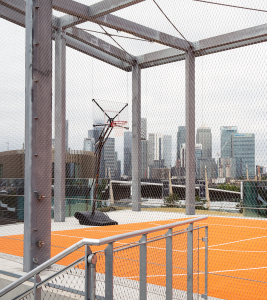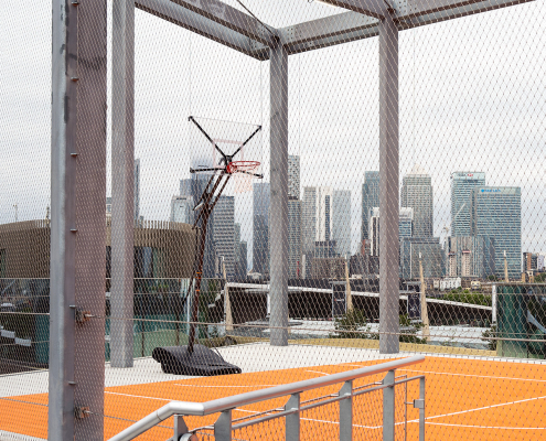On the east side of the main entrance to London’s Greenwich Design District is Building C1 — three levels of workshops and ateliers, with a basketball court on the roof, all encased in mesh. The building’s circulation route runs around the exterior.