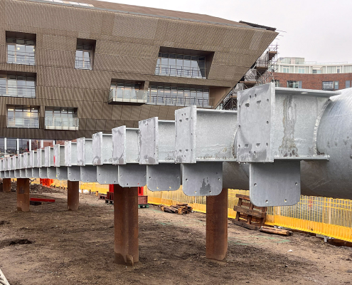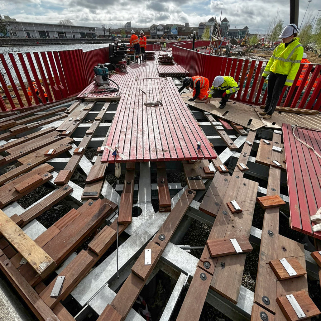 The Southern Steps area is founded on reclaimed land within the dock. This was achieved by installing sheet piling to form a new dock wall 10m inside the existing wall, along the southern boundary. The area behind the new wall has been infilled with stabilised soil, enabling the boardwalk’s south abutment and the Steps’ hard and soft landscaping to be founded on shallow groundbearing foundations.