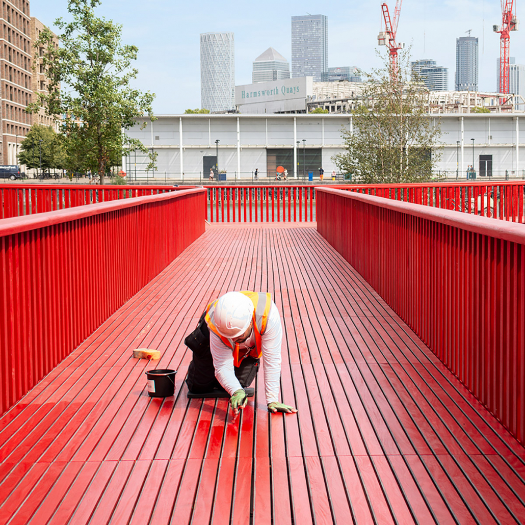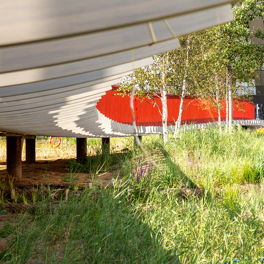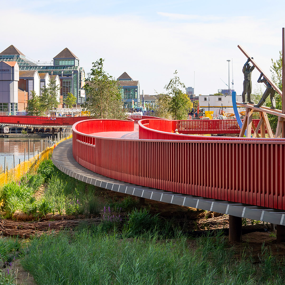 The award-winning Rafter Walk is a 170m steel-frame bridge with distinctive timber fins, designed by architect Asif Khan Studio and engineering by Whitby Wood. It winds through London’s historic Canada Dock accompanied by new wetlands, and is part of British Land’s Canada Water Masterplan project — a joint venture with AustralianSuper to redevelop 53 acres of Rotherhithe into a mixed-use urban centre.