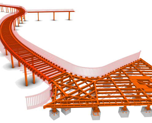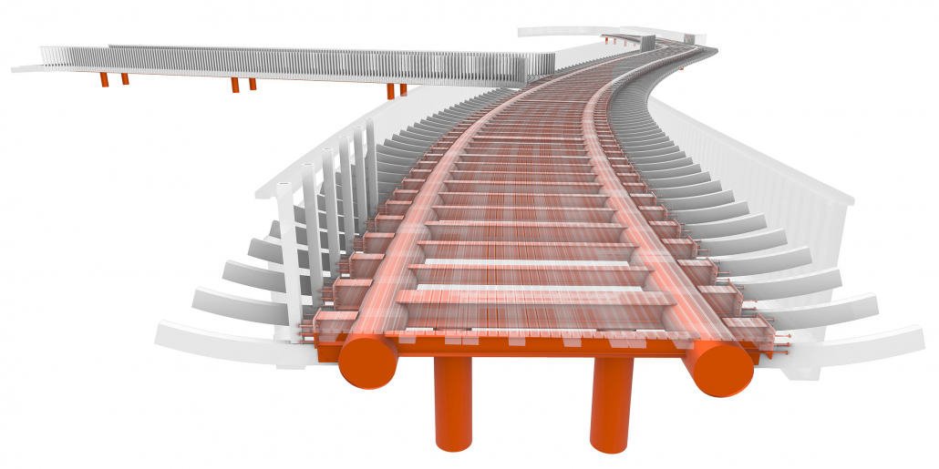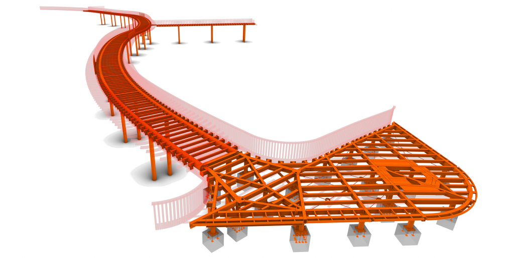 The double-curved 4.2m wide boardwalk is designed to bridge codes and is curved in elevation and plan. Its steel beams typically span 8m between supports formed by pairs of driven steel piles that are coupled by cross elements to form a ladder frame. Timber bearers support cassette decking panels, and steel fin plates connect architectural timber fins on the underside of the bridge. A straight link bridge connects the west dock edge to the centre of the main boardwalk.