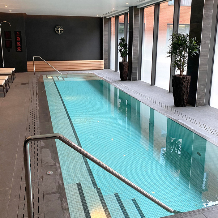 A basement covers the full site, housing car parking for hotel guests, plus back-of-house areas and plant. At ground level, a landscaped quad occupies the centre of the site, along with a leisure centre and swimming pool.