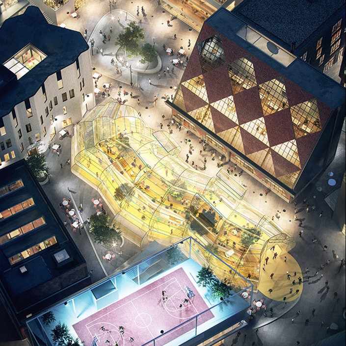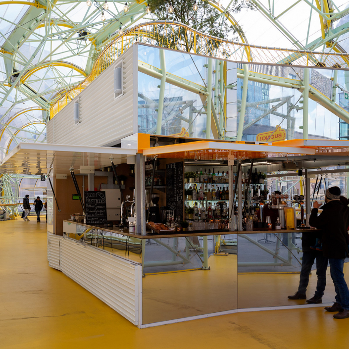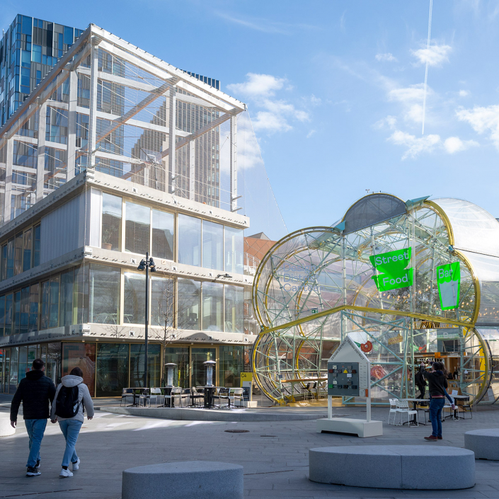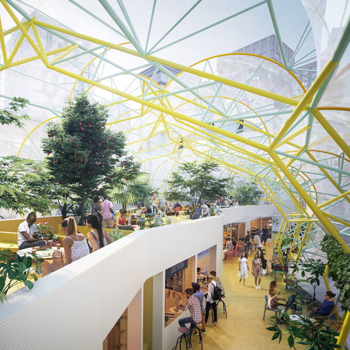 The dual-level food market is composed of a series of steel truss frames forming a winding tunnel, clad in plastic polymer (ETFE) — creating a bubble-like effect. Up to 20 modular food stalls are accommodated. Entrances are at each end of the structure, with intermediate informal openings possible at various points.