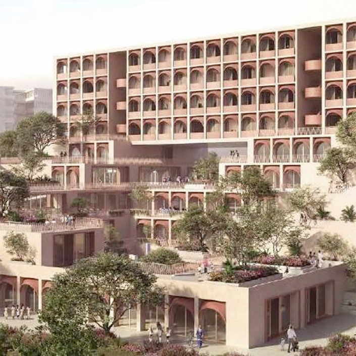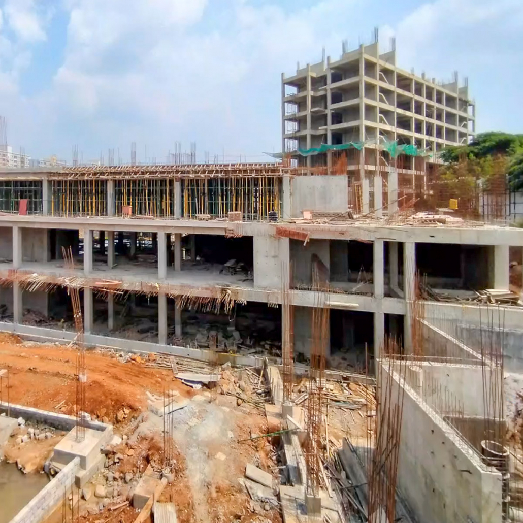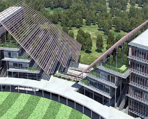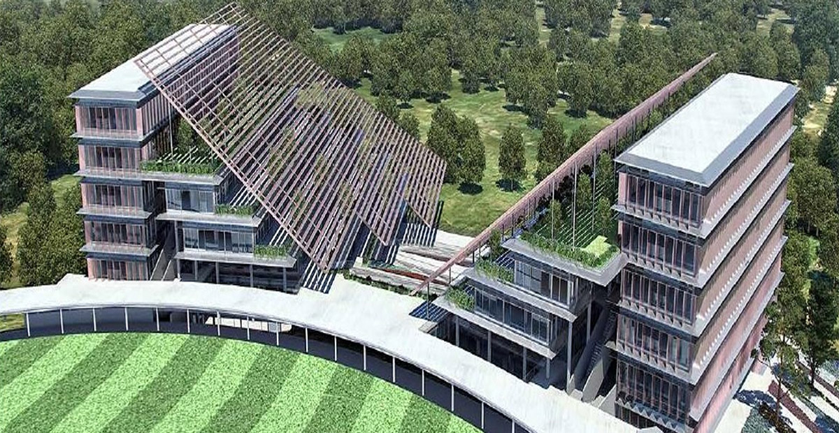 At the Talegaon campus of DY Patil University in Pune, India, the Mumbai office (Whitby Wood Pritamdasani) is working on the structural design of three new buildings ranged around the existing cricket ground — a 1200-student Design School to the west, a 1200-student Technical School to the north, and a 3000-student K12 School to the north-east.