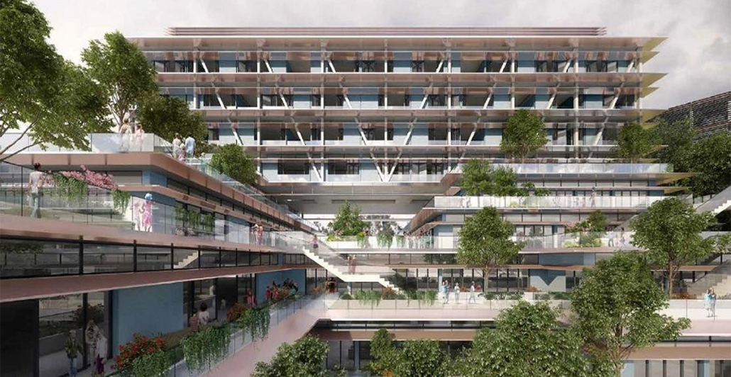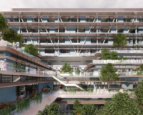 The K12 School poses the challenge of supporting six floors of teaching spaces and terraces on a 16m transfer girder. The area supported covers almost 40% of the building’s footprint. Three basement levels accommodate music rooms, teaching spaces, a multipurpose hall plus a courtyard. Students from primary to higher grades will attend, and the school is to be affiliated with Cambridge University in the UK.