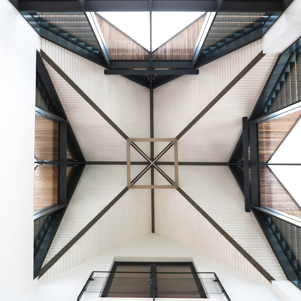 The structural design and detailing were done in a way that is sensitive to the adjacent listed heritage fabric. The new building incorporates cantilevered foundations so as not to undermine existing footings, and the envelope of the extension was detailed with levels of insulation and airtightness approaching PassivHaus standards.