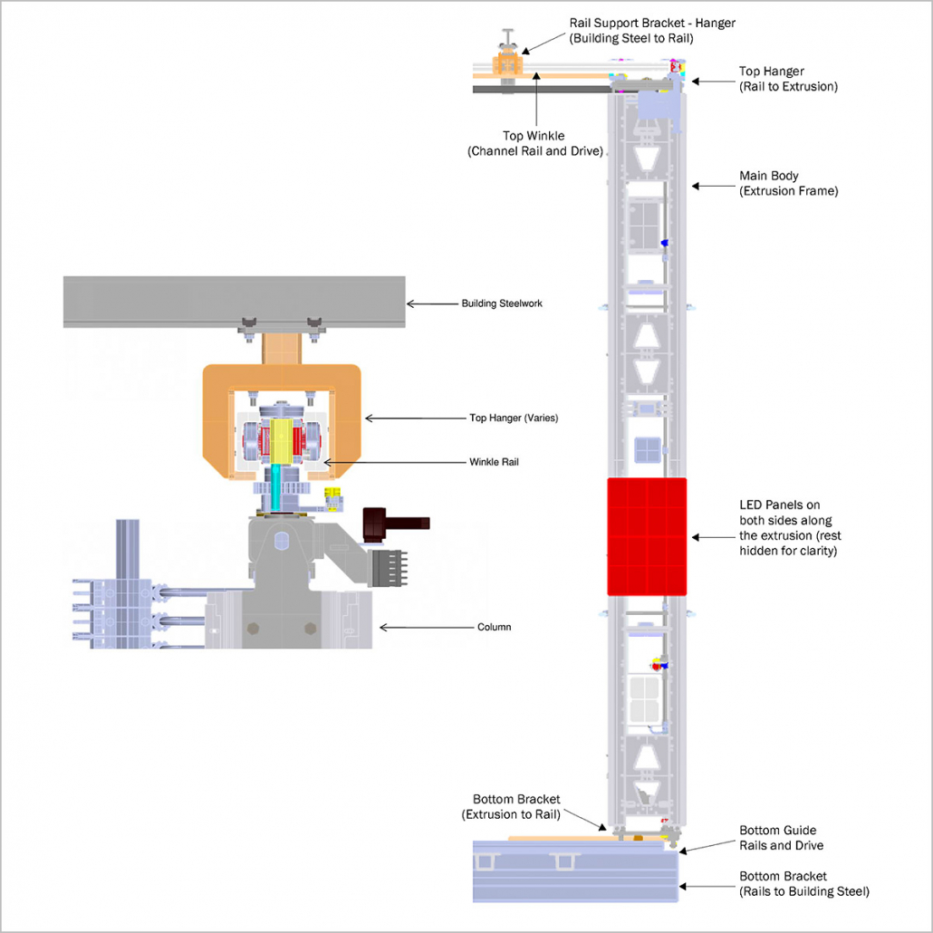 We provided engineering consultation and a review of technical fabrication drawings by Brilliant Stages. The kinetic screens consist of 42 panels (hanging from top rails and restrained laterally at the base), each 960mm wide and approximately 9m high, making it possible for the screens to navigate the corners of the track. Our assessments included elements such as extrusion frames, top and bottom rails and drives, rail support brackets and connections to the building’s steel frame.