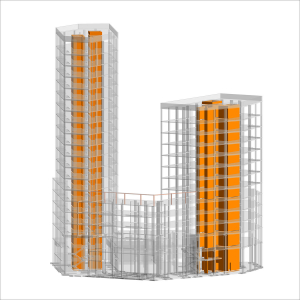 Other structural elements include concrete shear walls around the circulation cores in the towers for lateral stability, and large transfer structures at levels one and two to manage the change in grid layout from the commercial and parking areas at ground and first floor to the residential zones above. The transfer structures also enable the inclusion of a triple-height entrance foyer.