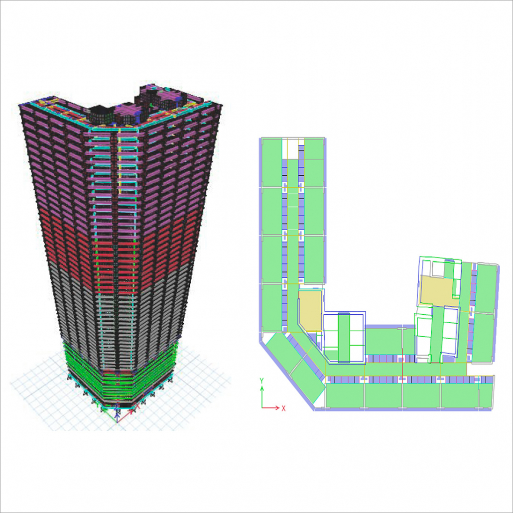 The Sector 6 buildings share reinforced concrete and steel podium structure, including two basement levels, retail outlets and covered car parking. Above the shared levels, the two towers are separated by landscaped green space and amenity areas. Residential units fill the towers between refuge levels at every seventh floor, services levels on the ninth and 36th floors, and rooftop terraces.