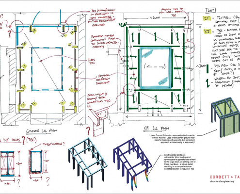 Work included two timber extensions: contemporary, generously proportioned and glazed box-like structures with exposed timber and steel hybrid structural frames. In order to extend the semi-basement, the existing footings were underpinned to create a deeper reinforced concrete substructure.