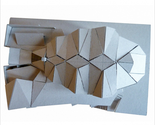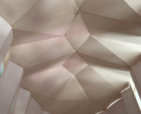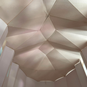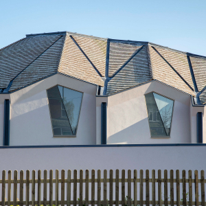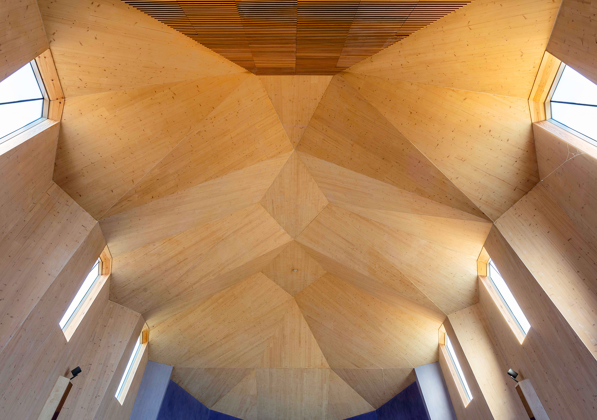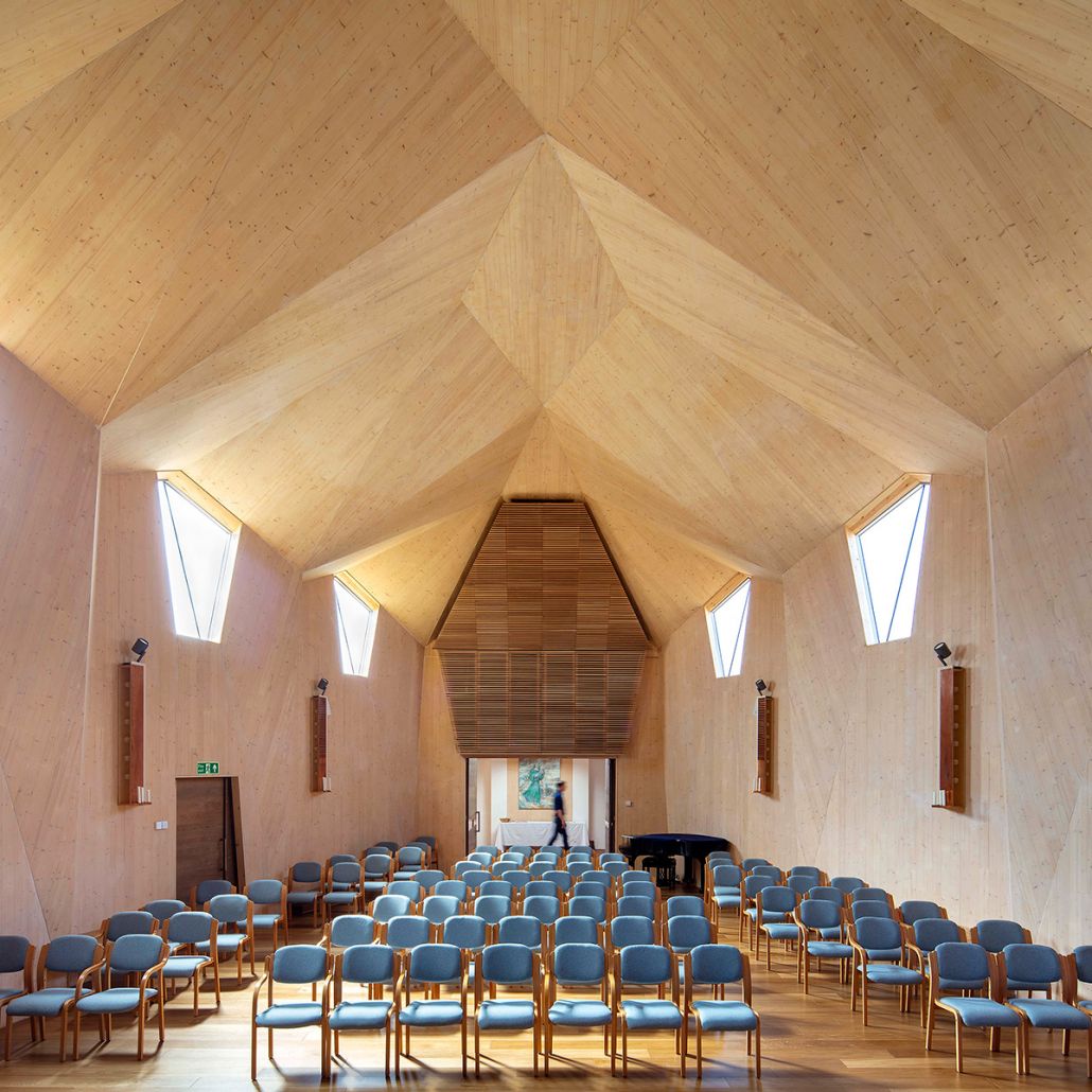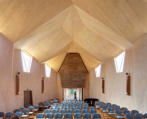 The choice of sustainably sourced CLT gave the designers far more freedom of form than using traditional loadbearing materials. The structure is a ribbed monocoque, where the service wings resist any side-thrust from the roof. The panelised timber frame is exposed internally as a feature of the chapel space and was designed using an innovative and geometrically complex folded plate technique, reminiscent of the stone vaulting in historic cathedrals. It also enhances the acoustics.