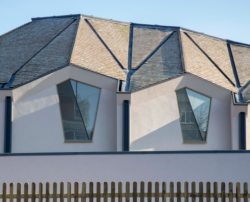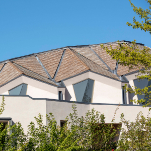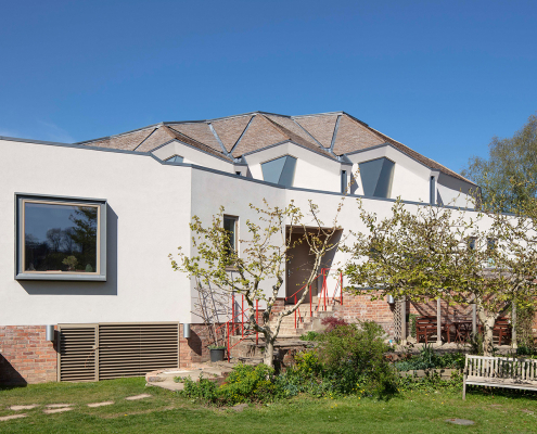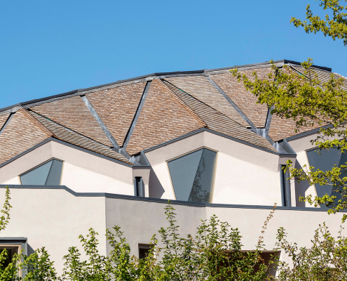 The west end of the roof is integral to the passive ventilation system — the roof form maximises the Venturi effect, producing negative air pressure around the outlets. Fresh air is drawn from outside, preheated as necessary and released at low level into the chapel. Damper units concealed by the acoustic screen control the airflow and react to wind direction.