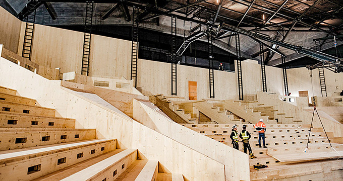 The whole sculpture measures 1.8m high by 4m wide and weighs almost a tonne. Safe and economic transportation and installation was the main challenge. Working with the contractor, we devised a four-panel solution, with each panel attached to a marine plywood backing. On site, they were slotted into place onto steel angle fixings attached to the blockwork wall of the building.